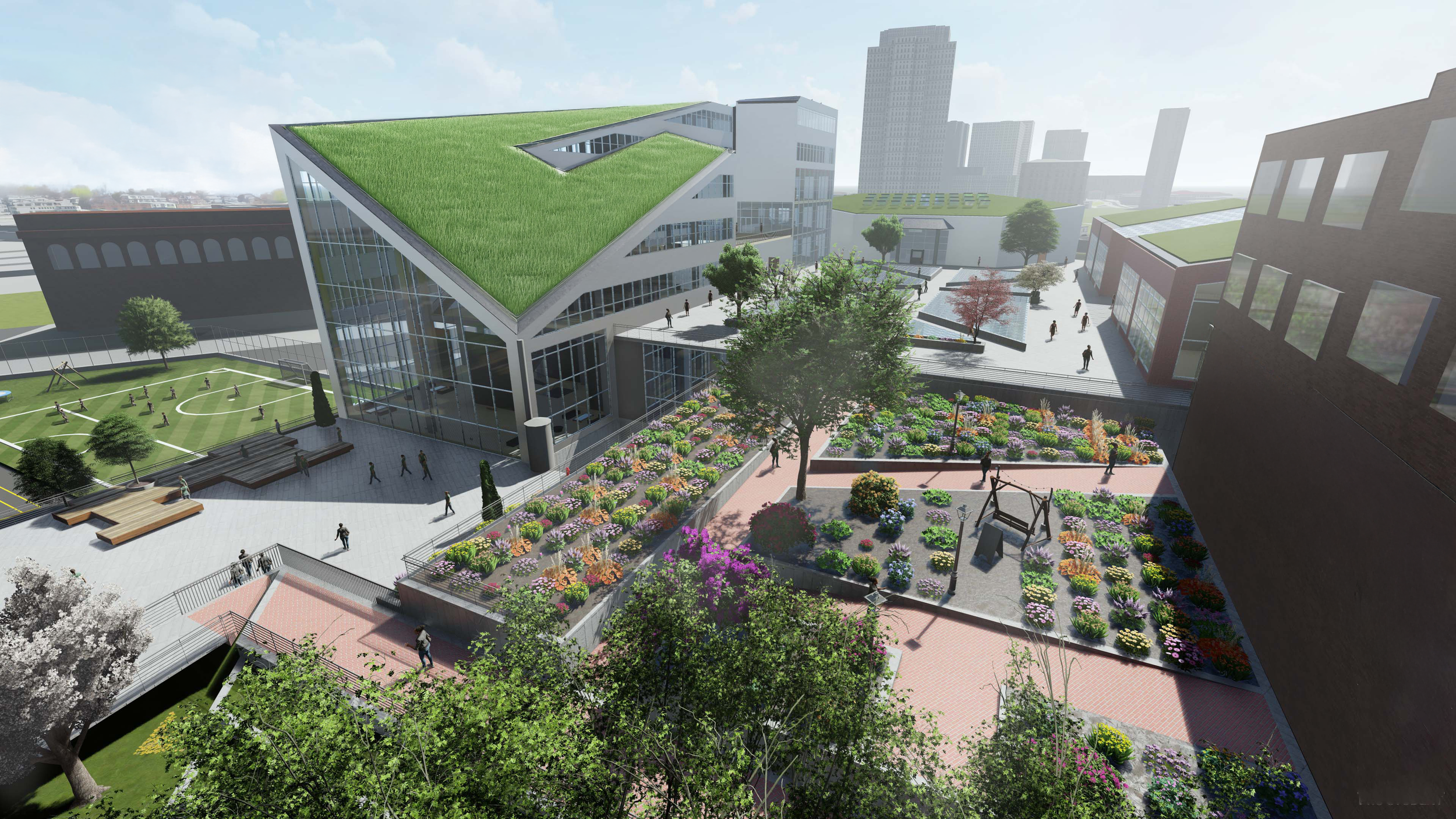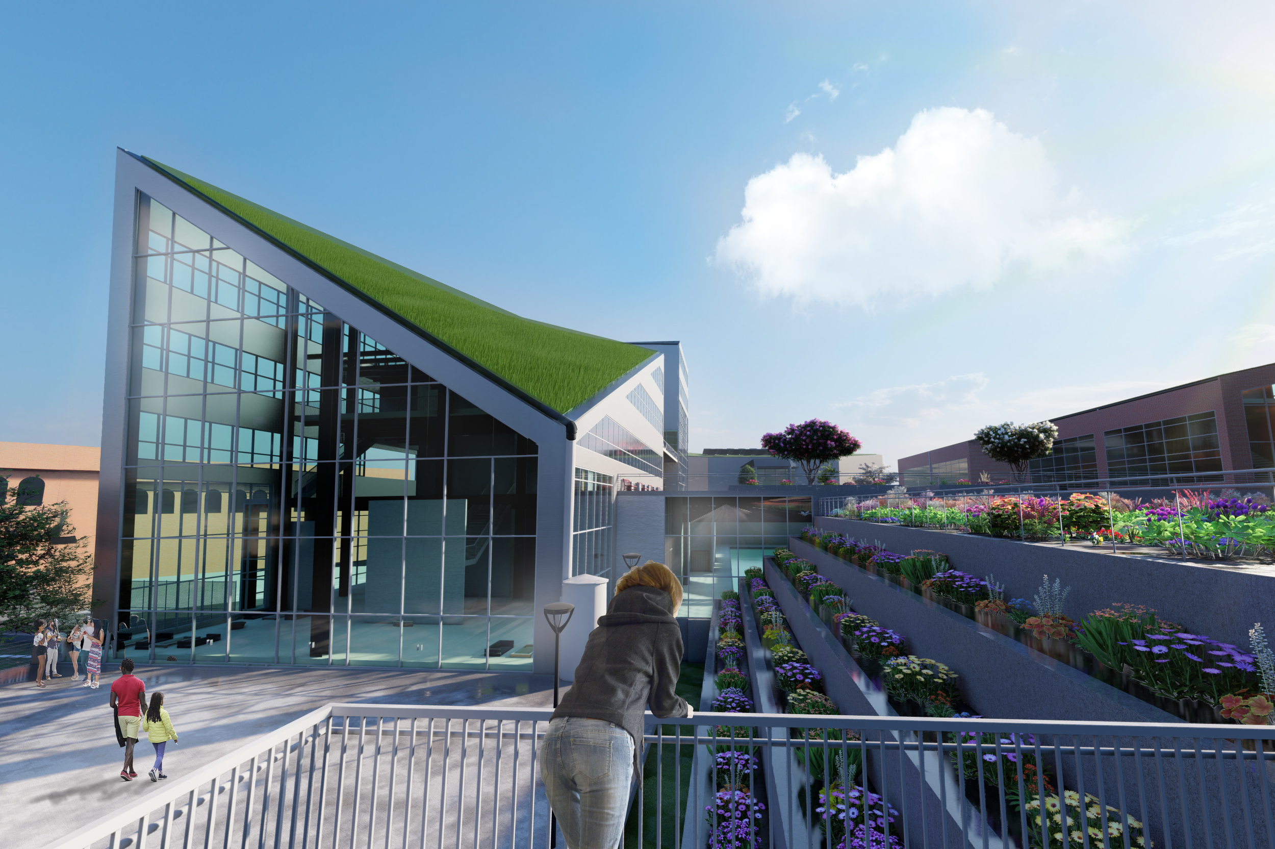 Sustainability features like a green roof and public green spaces—including a soccer field—support stormwater management, urban cooling, and community wellness, creating a vibrant, all-day urban destination.