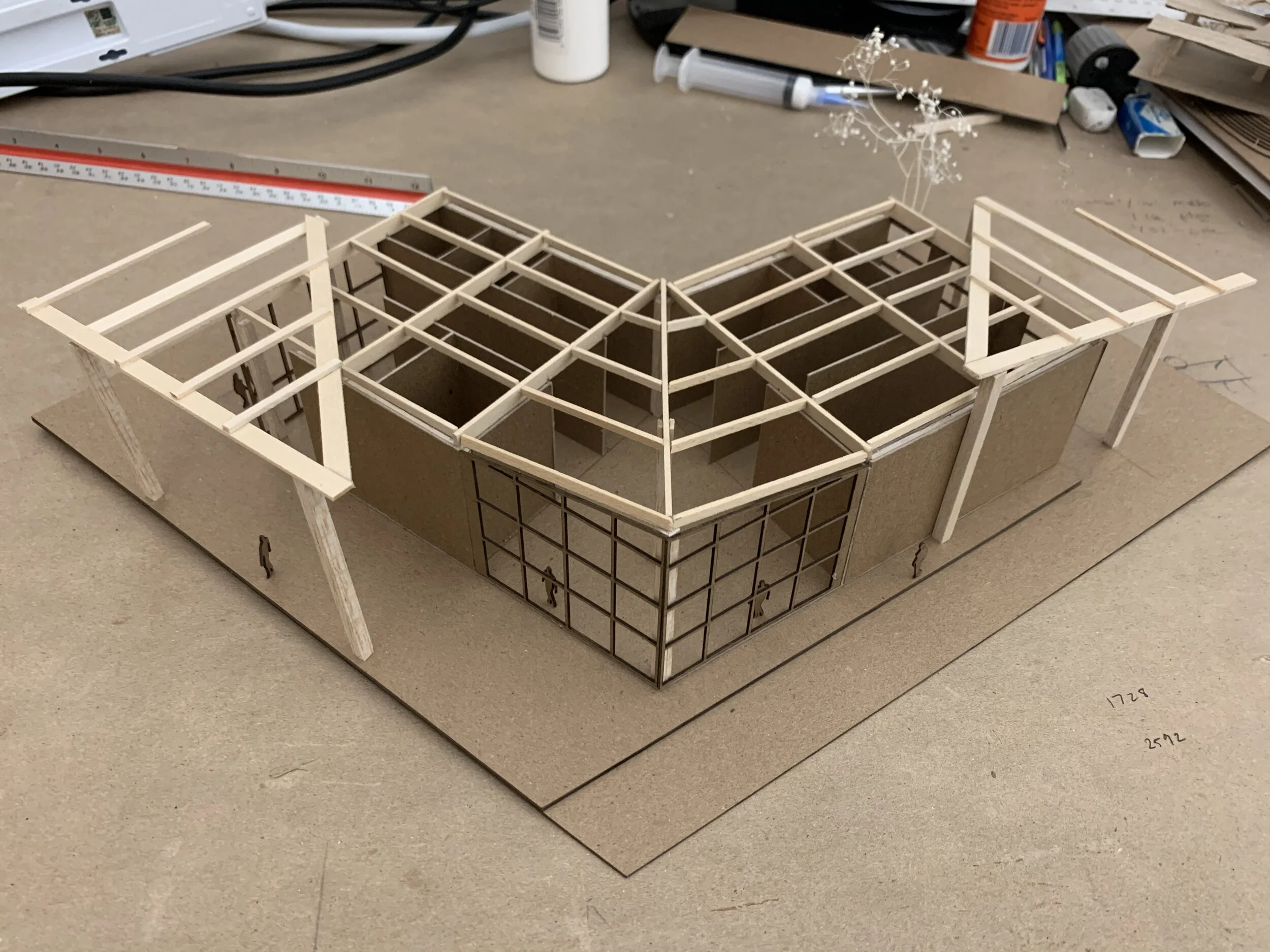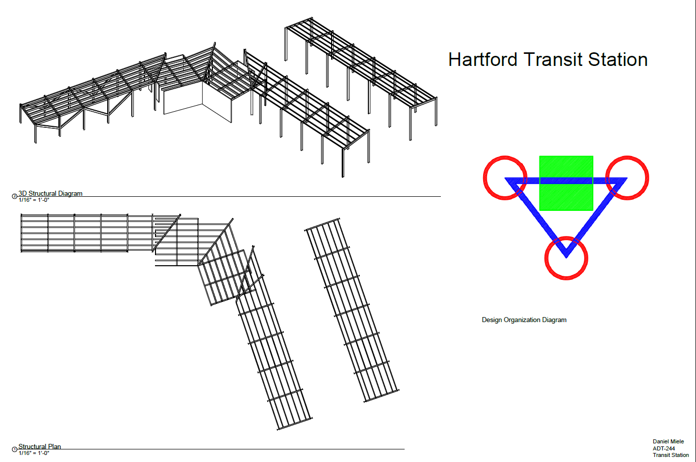 The University of Hartford Bus Station was constructed of steel members ranging to a maximum length of 40 feet. The building was constructed using bearing walls, as well as independent columns to carry the load of primary and secondary beams. The structural system can be seen in the structural model, as well as the physical model.